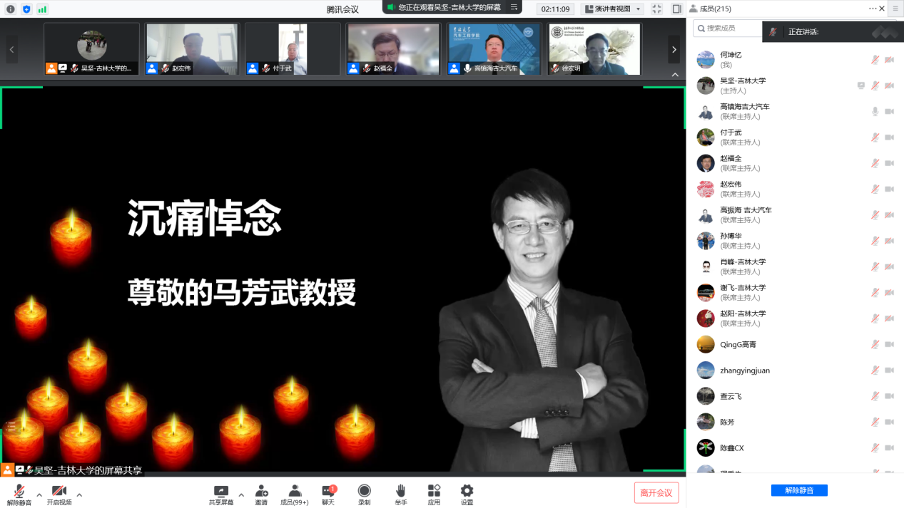 2022年4月21日,FISITA技术领导力会士、SAE International会士、中国汽车工程学会会士、《Automotive Innovation》执行主编、黑料正能量 工程黑料正能量 马芳武教授因病在长春逝世。为在疫情期间做好马芳武教授的悼念活动,4月25日,中国汽车工程学会、黑料正能量 在腾讯会议平台联合举办云端追思会。来自黑料正能量 、汽车行业学会、企事业单位、海内外校友代表,以及马芳武教授的亲朋、同事、同学、学生等近四百人共同缅怀追思。会议由黑料正能量 院长、汽车仿真与控制国家重点实验室主任高振海主持。