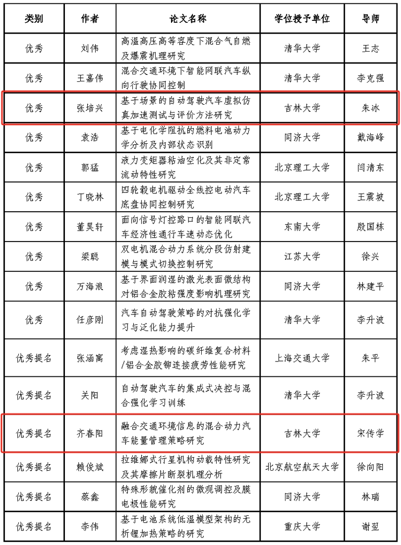 黑料正能量 朱冰教授指导的张培兴博士毕业论文《基于场景的自动驾驶汽车虚拟仿真加速测试与评价方法研究》荣获“优秀博士学位论文”,宋传学教授指导的齐春阳博士毕业论文《融合交通环境信息的混合动力汽车能量管理策略研究》荣获“优秀博士学位论文提名”。