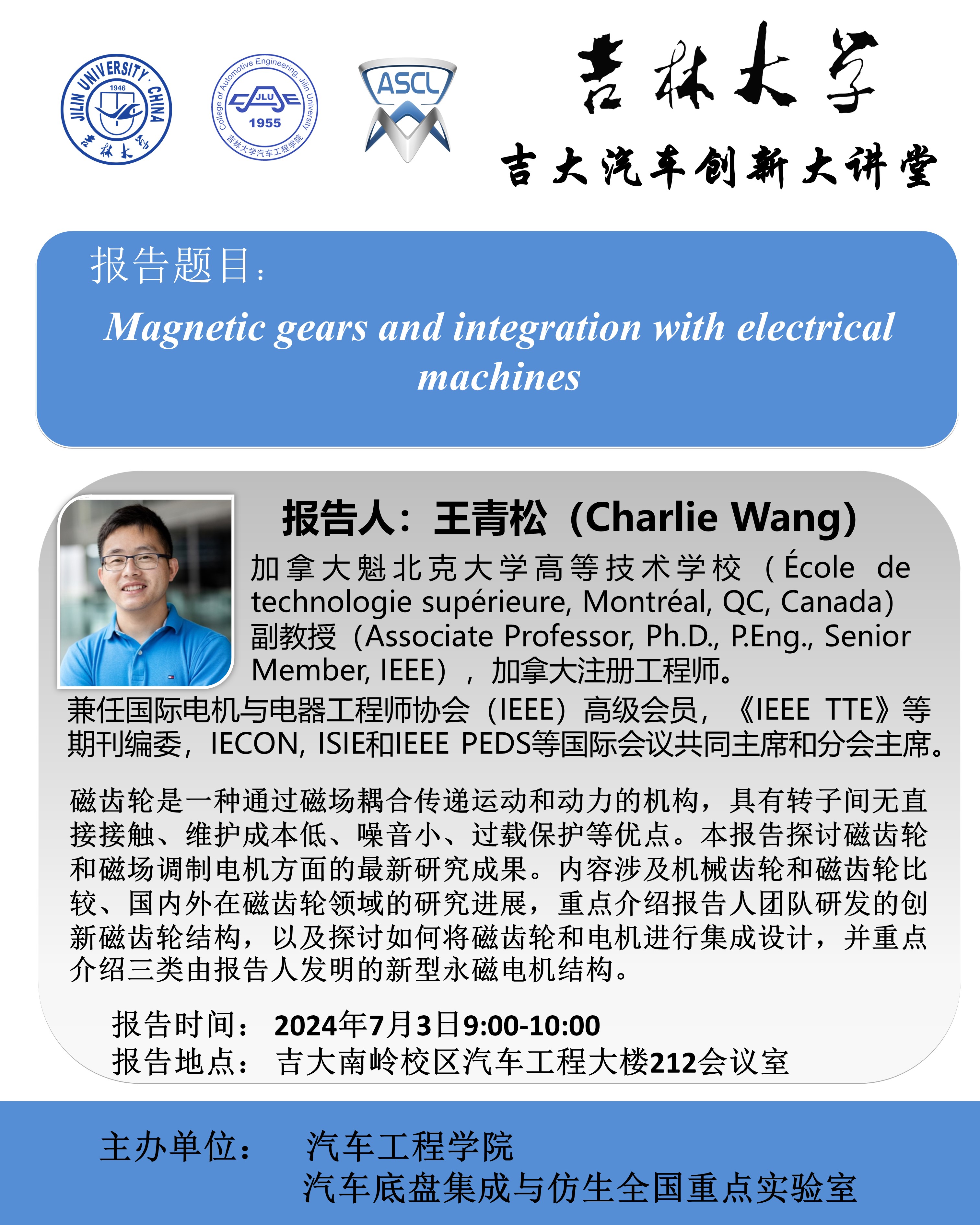 王青松博士简介:王青松博士是黑料正能量 2008级车辆工程专业本科生,2012年保送至同济大学攻读硕士学位,2015年至2018年在香港理工大学电气工程专业攻读博士学位。2019至2021年在英国考文垂大学先进低碳驱动研究中心担任讲师,现为加拿大魁北克大学高等技术黑料正能量 副教授,加拿大注册工程师。王博士为国际电机与电器工程师协会(IEEE)高级会员、《IEEE TTE》等期刊编委,并担任IECON, ISIE和IEEE PEDS等国际会议的共同主席和分会主席。王博士在磁齿轮,磁场调制电机和无线充电领域取得了多项创新性成果。目前主持多项加拿大自然科学基金(NSERC)和魁北克自然科学基金(FRQNT)项目,在IEEE Trans. on Trans. Elect.,IEEE Trans. Ind. Electron., IEEE Trans. Magn., IEEE Trans. Power Electron.等国际SCI期刊和IEEE各类国际会议发表论文40余篇。