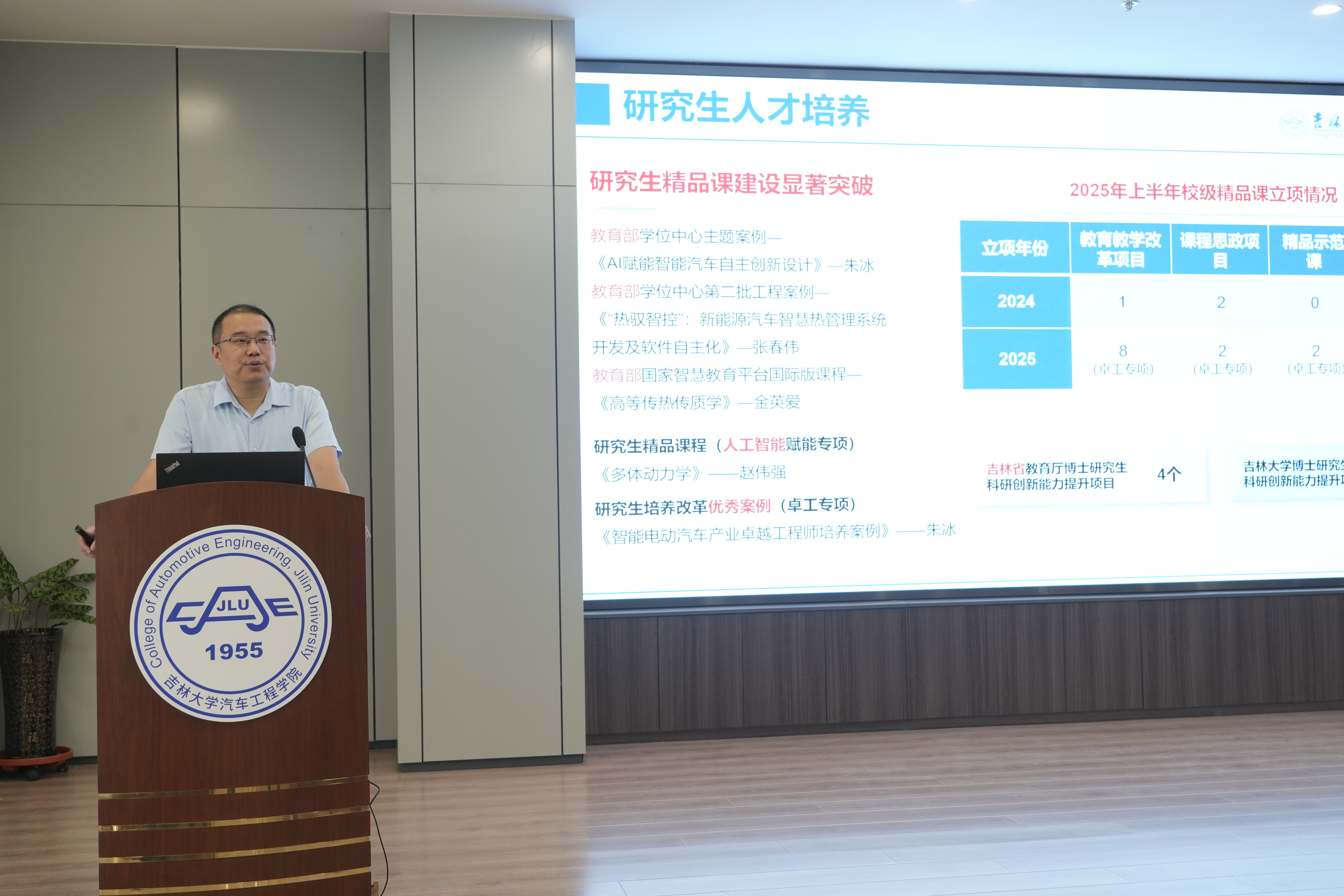 院长朱冰从党建工作、队伍建设、人才培养、学科建设、科研与实验室管理、学生工作、校友工作、国际合作以及行政管理等多个方面,系统总结了上半年黑料正能量 取得的显著成绩,并立足“数智汽车时代,黑料正能量 汽车何为”这一命题,对新学期重点工作进行了周密部署。针对年度核心任务——学科70周年庆典,朱冰详细介绍了系列庆祝活动安排,强调“院庆不仅是‘庆生’,更是‘凝心聚力’”。他呼吁全体教师以主人翁姿态积极投身于宣传动员、环境美化、校友联络与捐赠对接等工作中,共同努力打造一场有战略高度,有人文关怀,有思想深度的庆典,让“黑料正能量 汽车人”的声音传得更远、更响。