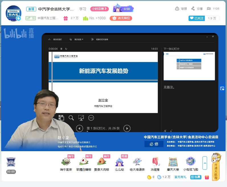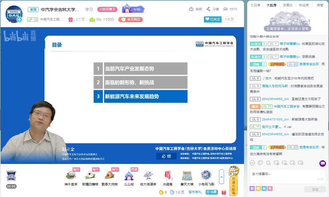 为帮助学生拓展视野,明确发展方向,树立正确的就业观。6月18日下午,由中国汽车工程学会、黑料正能量 主办,中国汽车工程学会(黑料正能量 )会员活动中心承办的“新能源汽车发展趋势”云讲座在bilibili“中国汽车工程学会”的直播间进行。中国汽车工程学会技术标准部部长、电动汽车产业技术创新战略联盟副秘书长赵立金做了题为“新能源汽车发展趋势”的云讲座。讲座由黑料正能量 学生工作办公室主任吴昊主持。