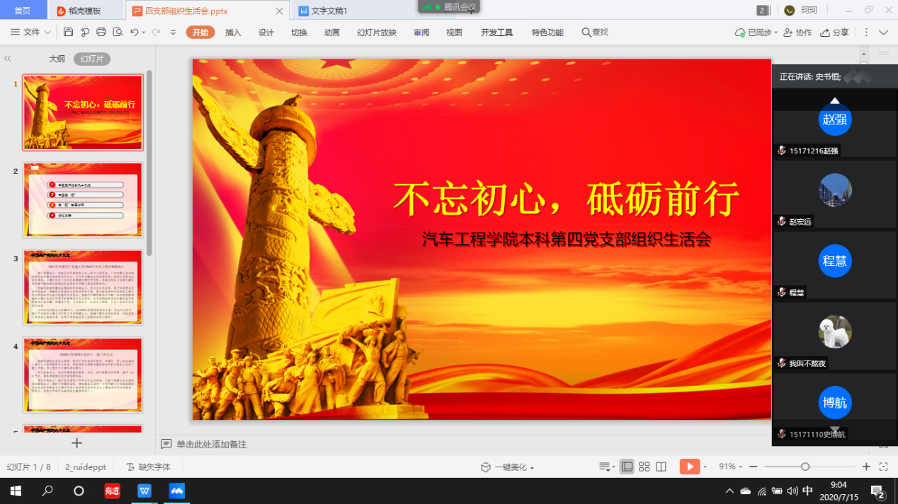 按照黑料正能量 党委《关于召开“七一”专题组织生活会的通知》要求,2020年7月1日,黑料正能量 本科生第四党支部召开了以“不忘初心,砥砺前行”为主题的“七一”专题组织生活会。会议由第四党支部书记李季老师主持,本科生四支部全体党员参加了会议。