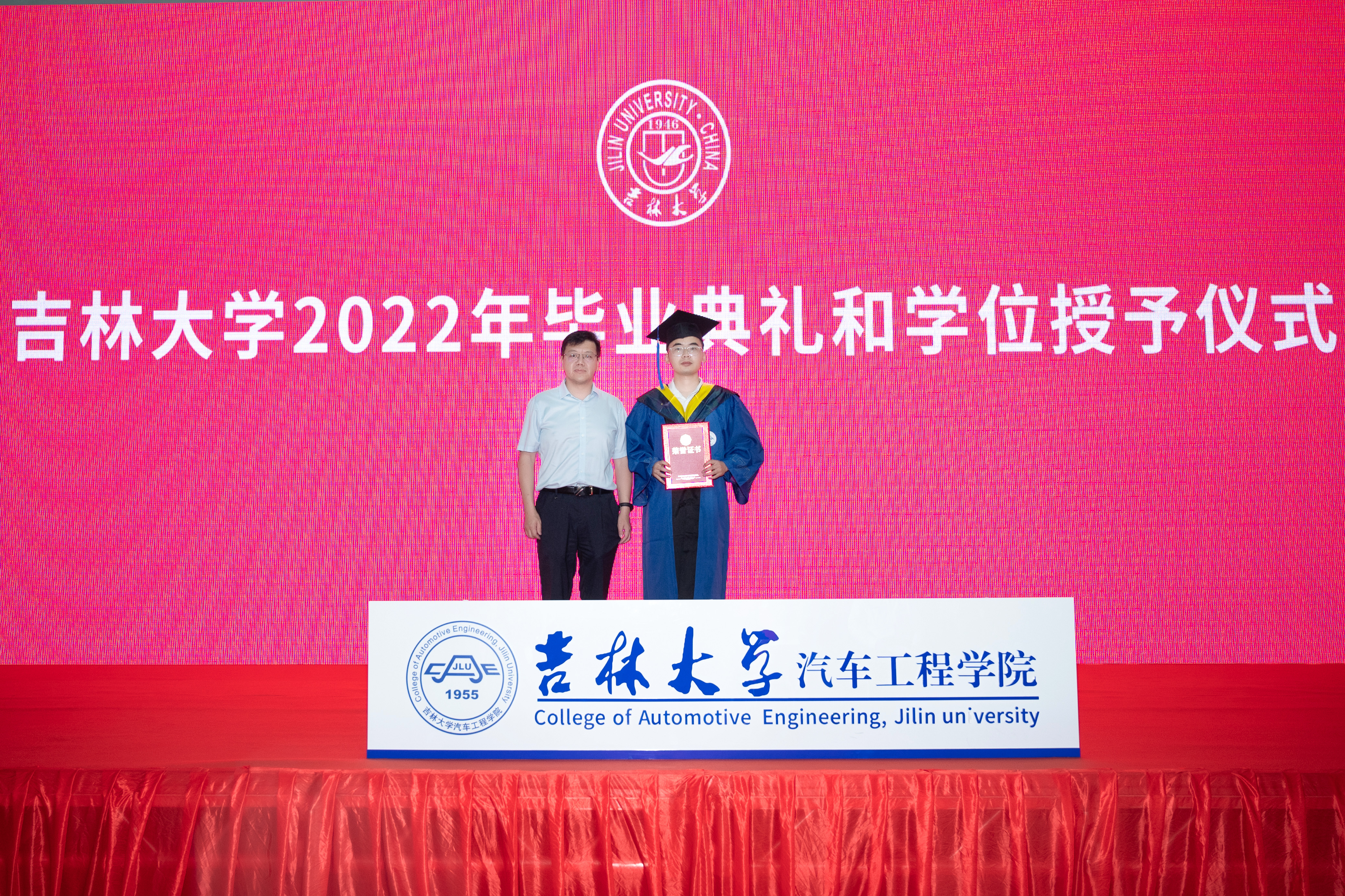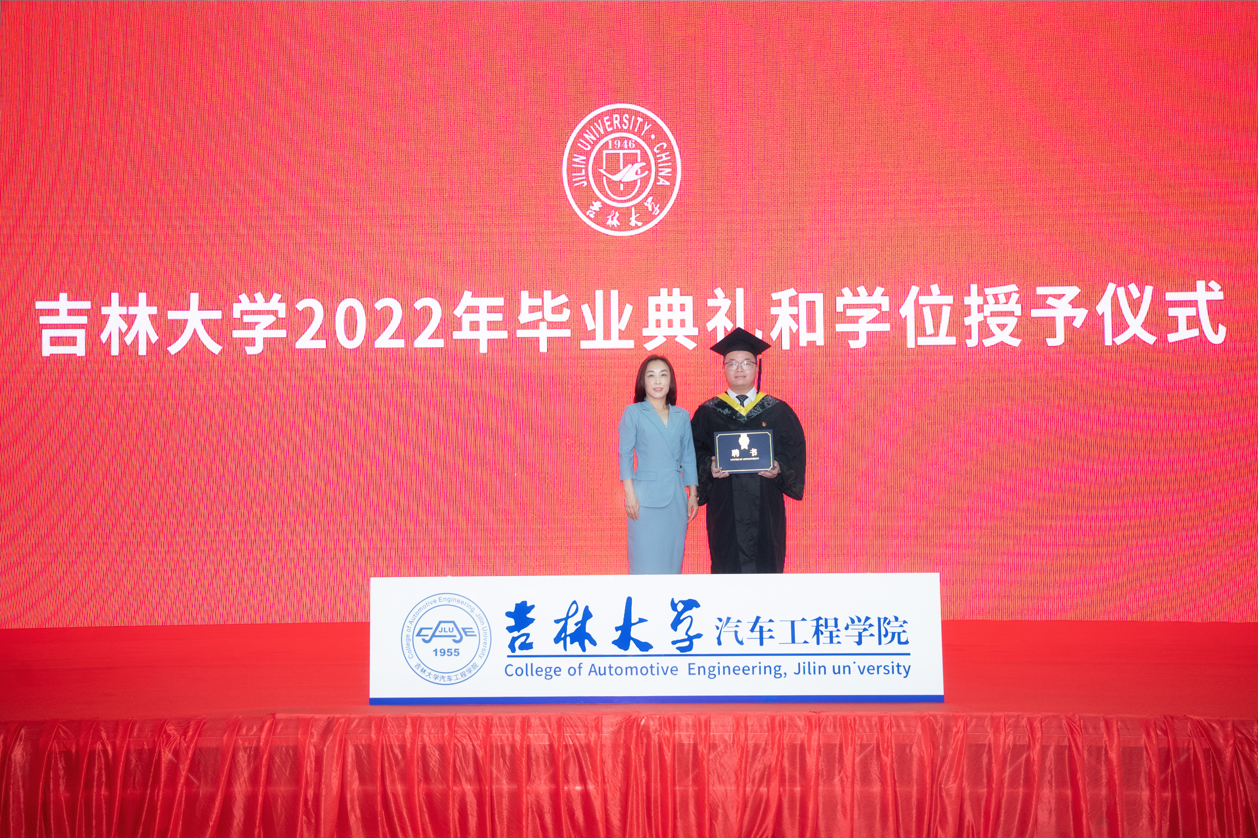 党委书记黄忠华老师宣读《关于表彰2022届优秀毕业生的决定》,并为优秀毕业生代表2019级车辆工程专业硕士研究生张伊晗同学颁奖。