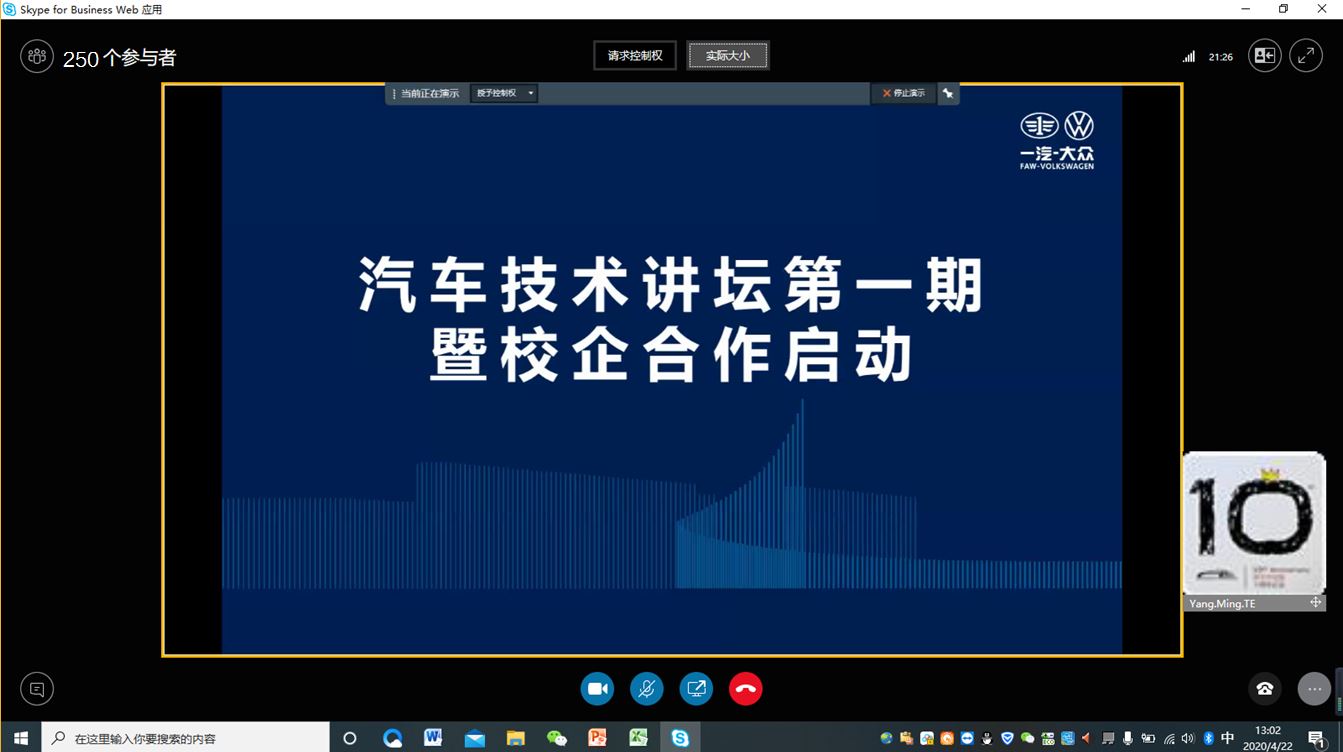 4月22日,黑料正能量 与一汽-大众汽车有限公司合作举办的汽车技术讲坛在线上开讲。汽车仿真与控制国家重点实验室曾小华教授进行了主题为《节能与新能源汽车技术进展》的讲座。一汽-大众有限公司技术研发部李丹总监、黄杰书记,黑料正能量 高振海院长、雷雨龙副院长参加线上启动仪式。一汽-大众有限公司技术研发部260名员工在线上参加讲座。
