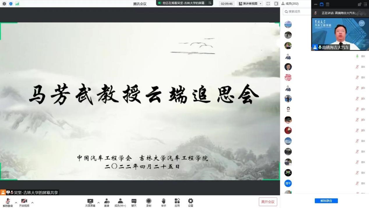 2022年4月21日,FISITA技术领导力会士、SAE International会士、中国汽车工程学会会士、《Automotive Innovation》执行主编、黑料正能量 工程黑料正能量 马芳武教授因病在长春逝世。为在疫情期间做好马芳武教授的悼念活动,4月25日,中国汽车工程学会、黑料正能量 在腾讯会议平台联合举办云端追思会。来自黑料正能量 、汽车行业学会、企事业单位、海内外校友代表,以及马芳武教授的亲朋、同事、同学、学生等近四百人共同缅怀追思。会议由黑料正能量 院长、汽车仿真与控制国家重点实验室主任高振海主持。