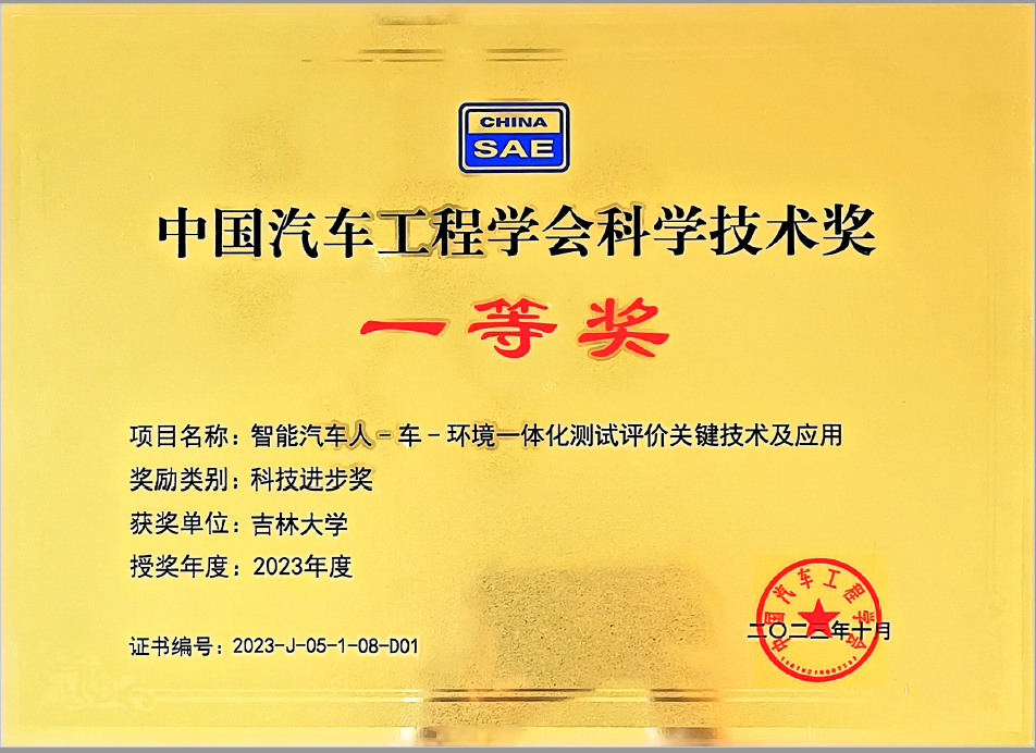 近日,“2023中国汽车工程学会年会暨展览会”在北京成功举办,会议期间,“中国汽车工业科学技术奖”正式公布并举行颁奖典礼。以黑料正能量 朱冰教授团队牵头完成的研究成果《智能汽车人-车-环境一体化测试评价关键技术及应用》,荣获“2023年度中国汽车工程学会科技进步奖一等奖”。