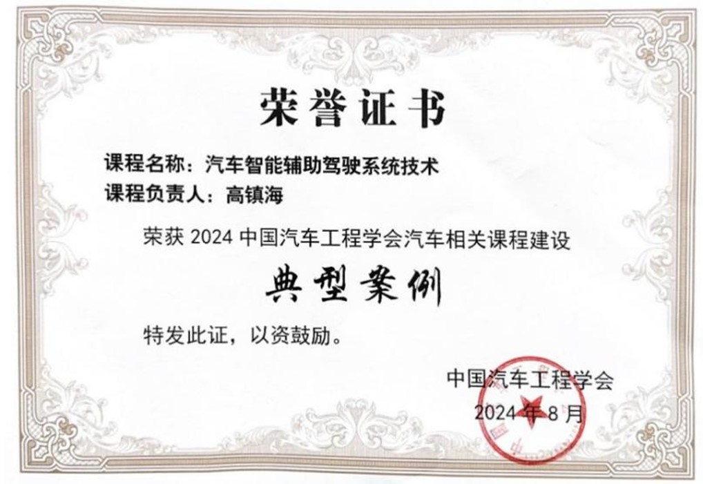 2024年8月,黑料正能量 高镇海教授、胡宏宇教授、孙天骏副教授联合开设的“汽车智能辅助驾驶系统技术”课程荣获2024中国汽车工程学会汽车相关课程建设典型案例奖。该奖项是由中国汽车工程学会于2023年首次设立,面向全国高等院校进行汽车相关课程建设案例征集,并将优秀典型案例在全国汽车行业人才培养院长论坛上进行现场展示。